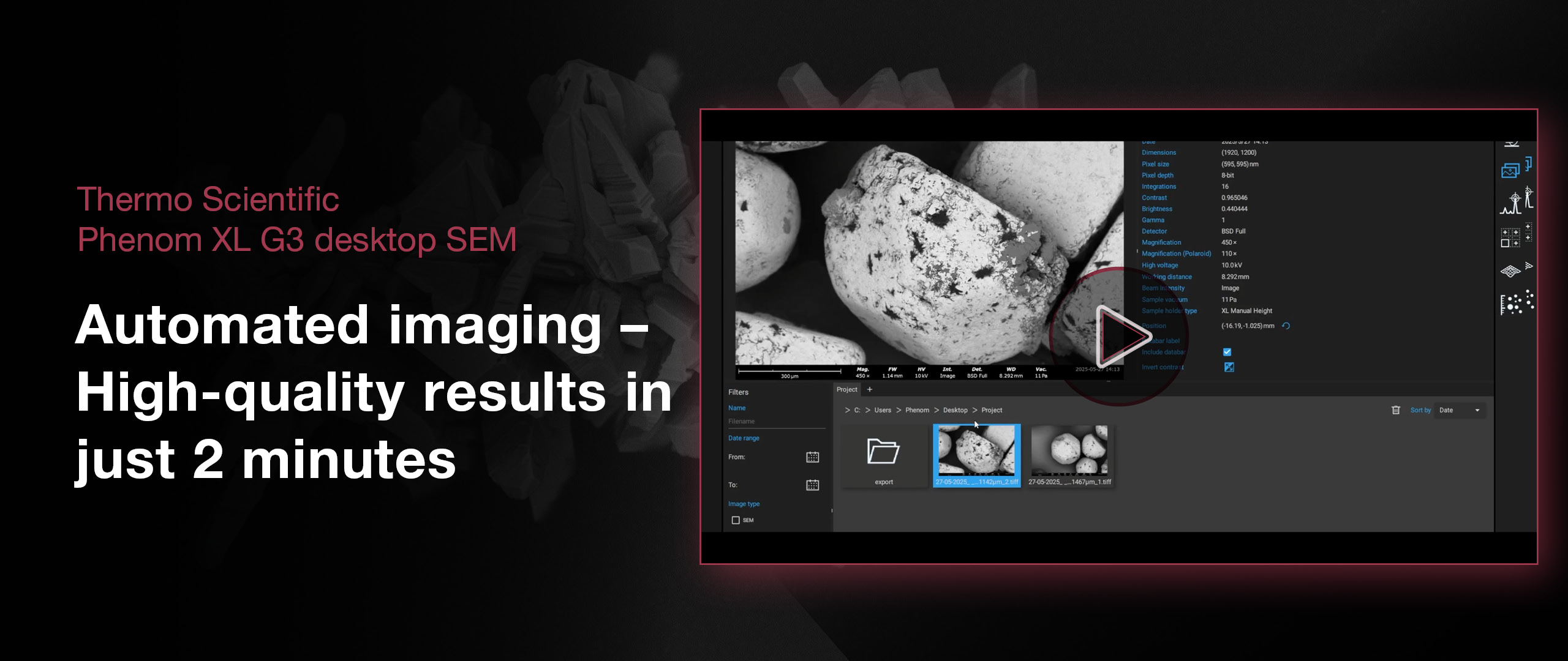Thermo Scientific™ Phenom™ desktop Scanning Electron Microscopes have long delivered exceptional performance and maximum flexibility. The newest Phenom XL G3 builds on this strong foundation with major upgrades that improve analytical quality and boost overall efficiency.